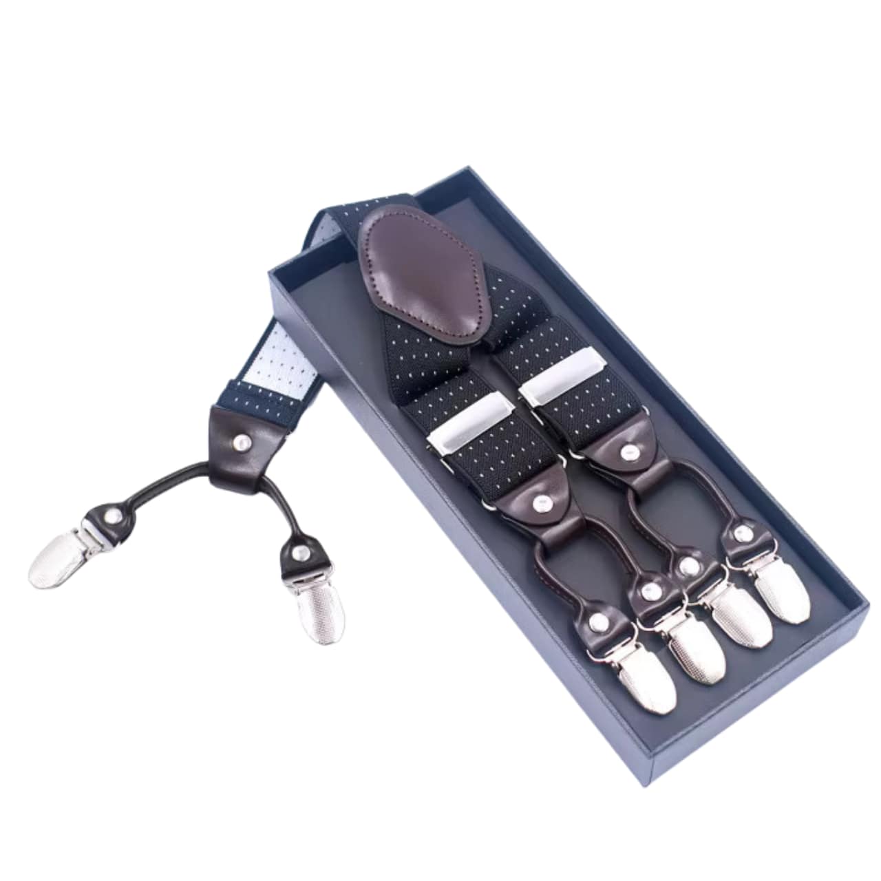 Need klassikalised mustad traksid annavad natuke särtsu oma täpilise mustriga. Täpselt nii palju kui vaja, et silma jääda. Y-kujuline tagatükk hoiab rihmad keskendatud ja stabiilsena ning metallist liugurid võimaldavad pikkust reguleerida eri särgipaksuste korral. Nööbrisilmadega sulgur asetseb madalal ja korrastatult, sobides hästi erinevate pükste stiilidega.