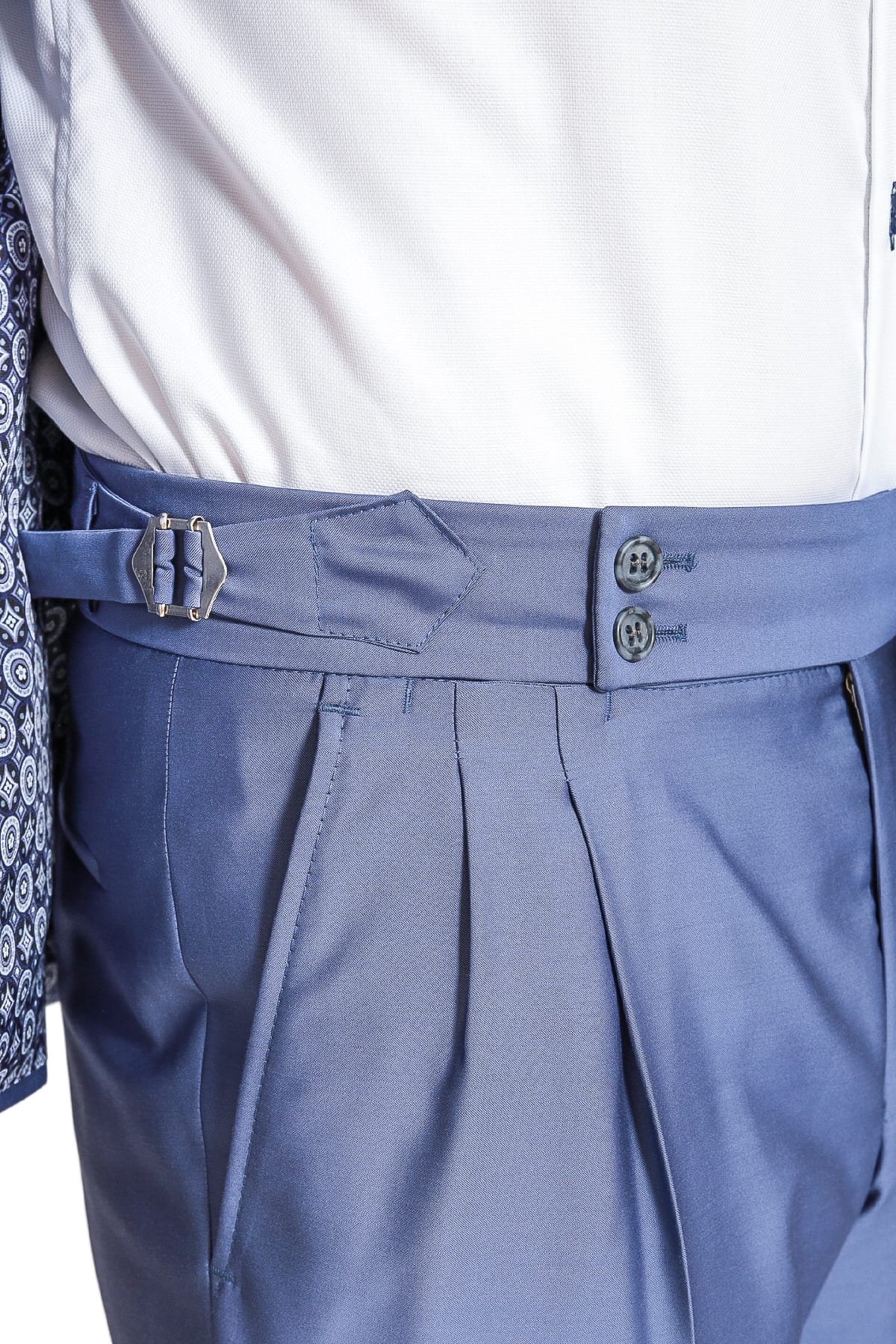 soft Italian shoulder and construction style. Neapolitan style trousers with double pleats and side adjusters.