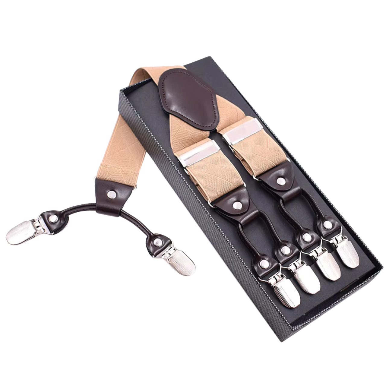 These soft beige suspenders blend in beautifully with light shirts, whilst bringing out the darker outfits by adding a simmer of light to the outfit. The Y-shaped backside holds the suspenders in a very comfortable and stable position, the metal parts allowing for length regulation, especially depending on the thickness of the shirt. A perfect fit for all kinds of trousers.