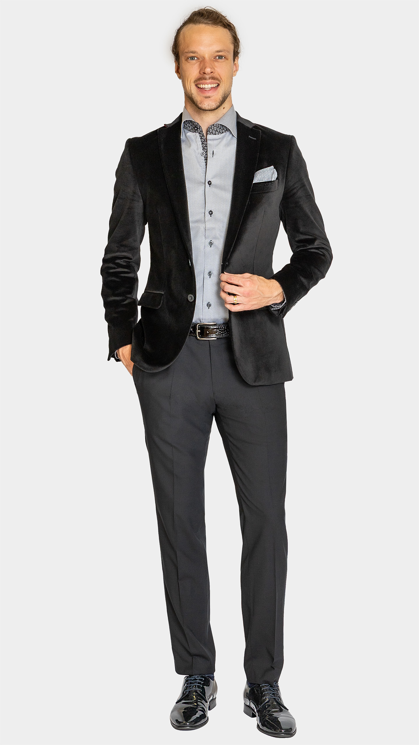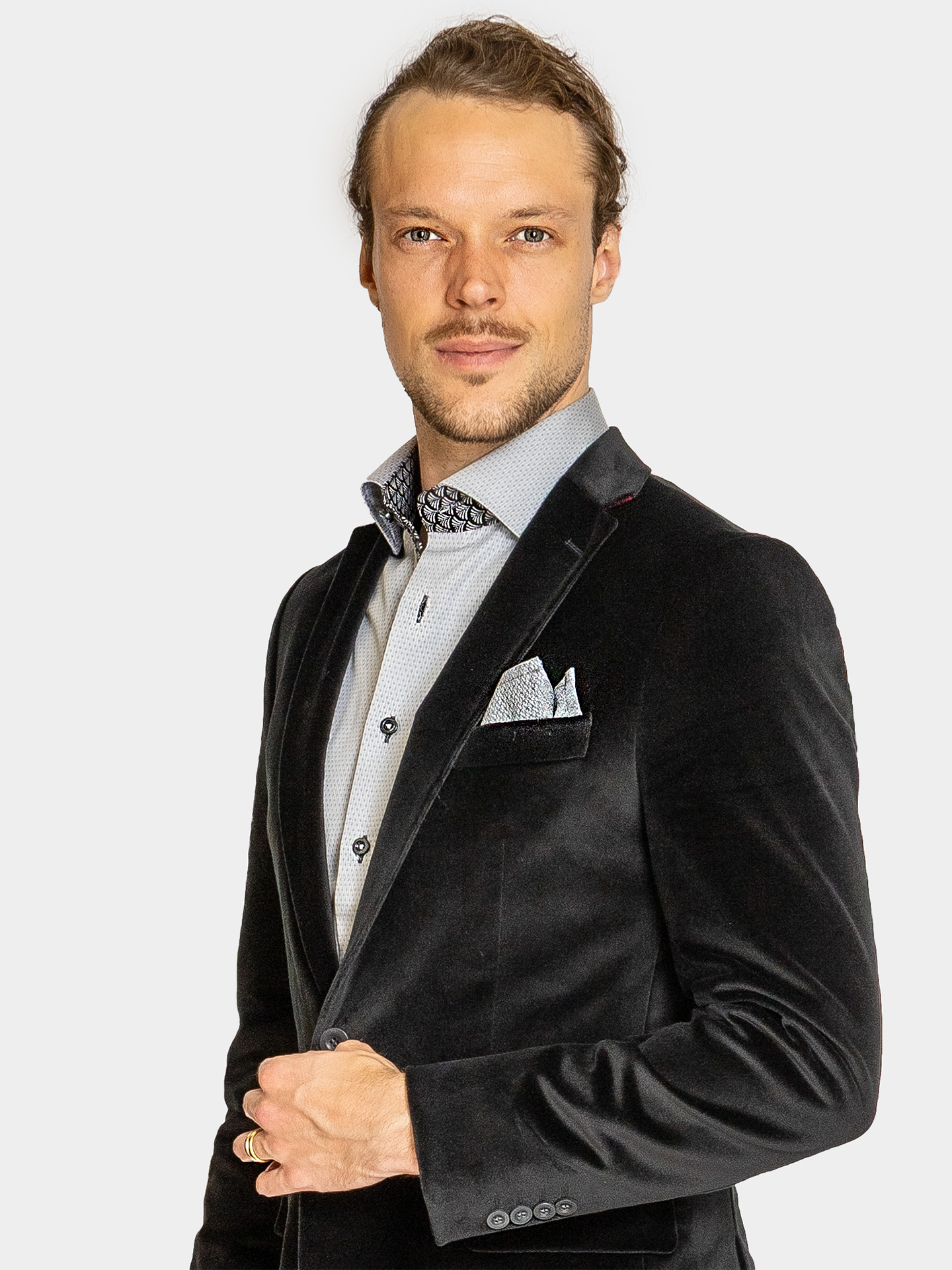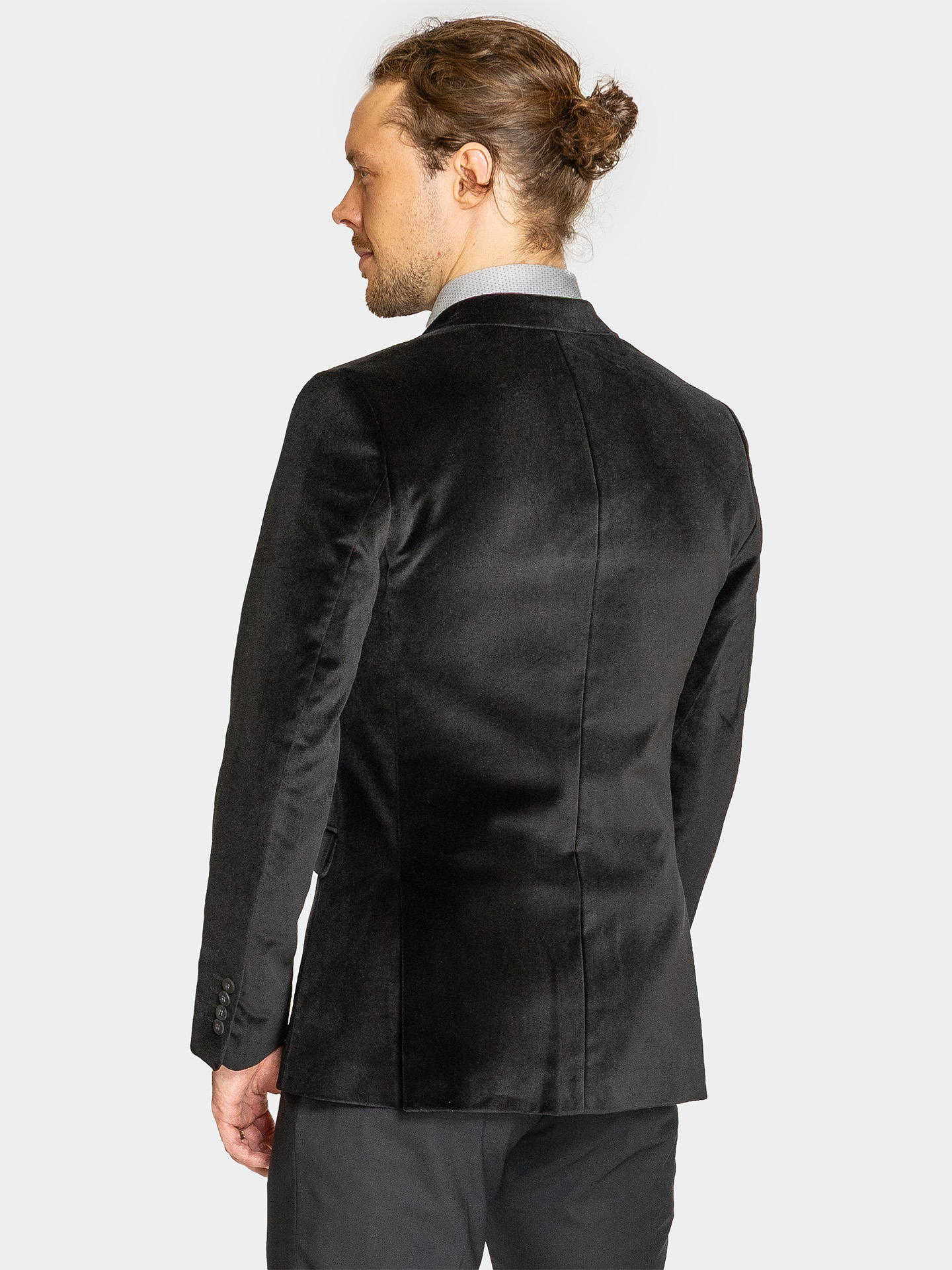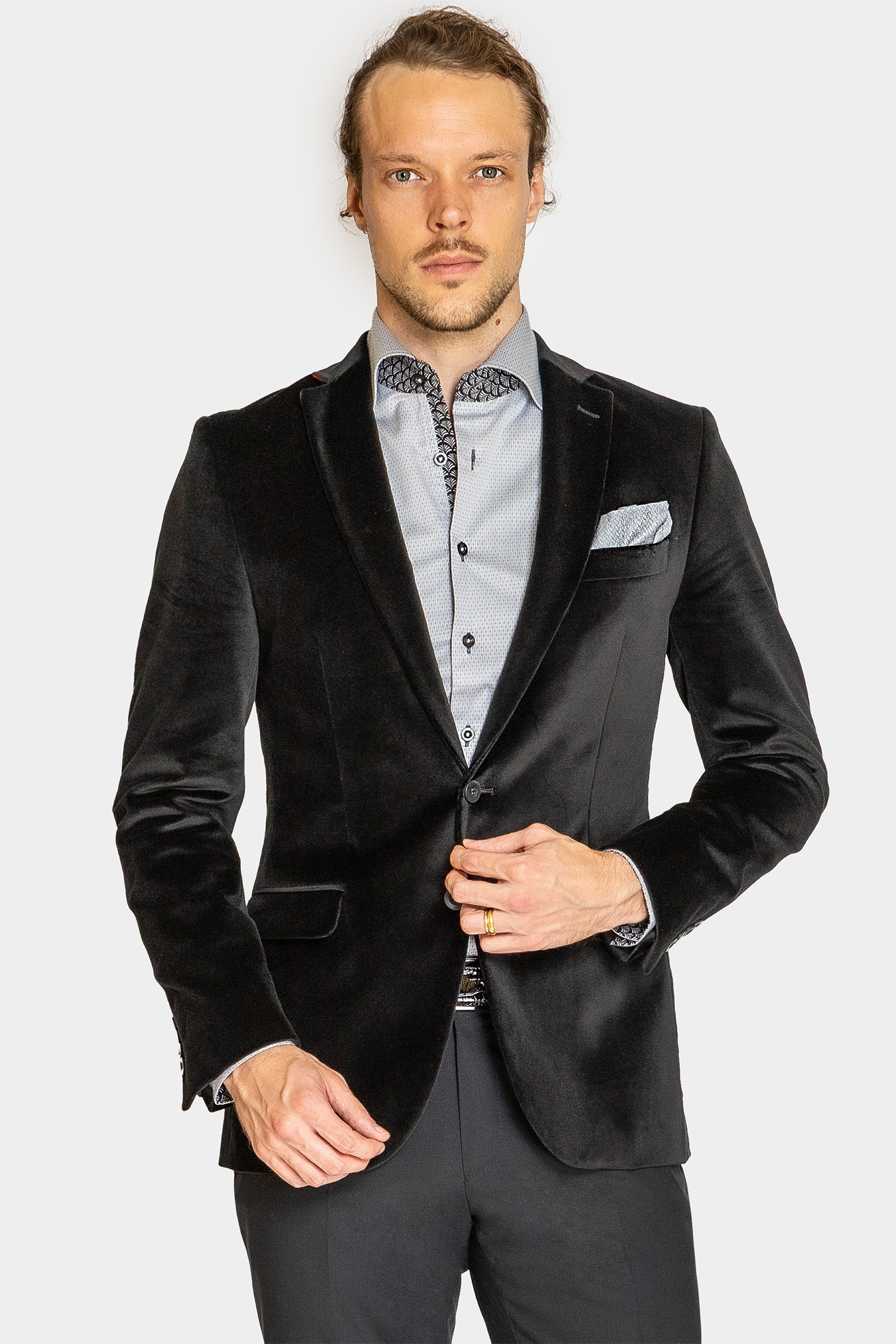 The Buckingham Black Jacket is made for grand evenings — velvet curtains, low candlelight, and a touch of mystery in the air. Crafted from pure cotton velvet, its deep black tone and tailored cut make a striking impression without ever raising its voice. A timeless piece for those who understand that elegance is quiet, but unforgettable.