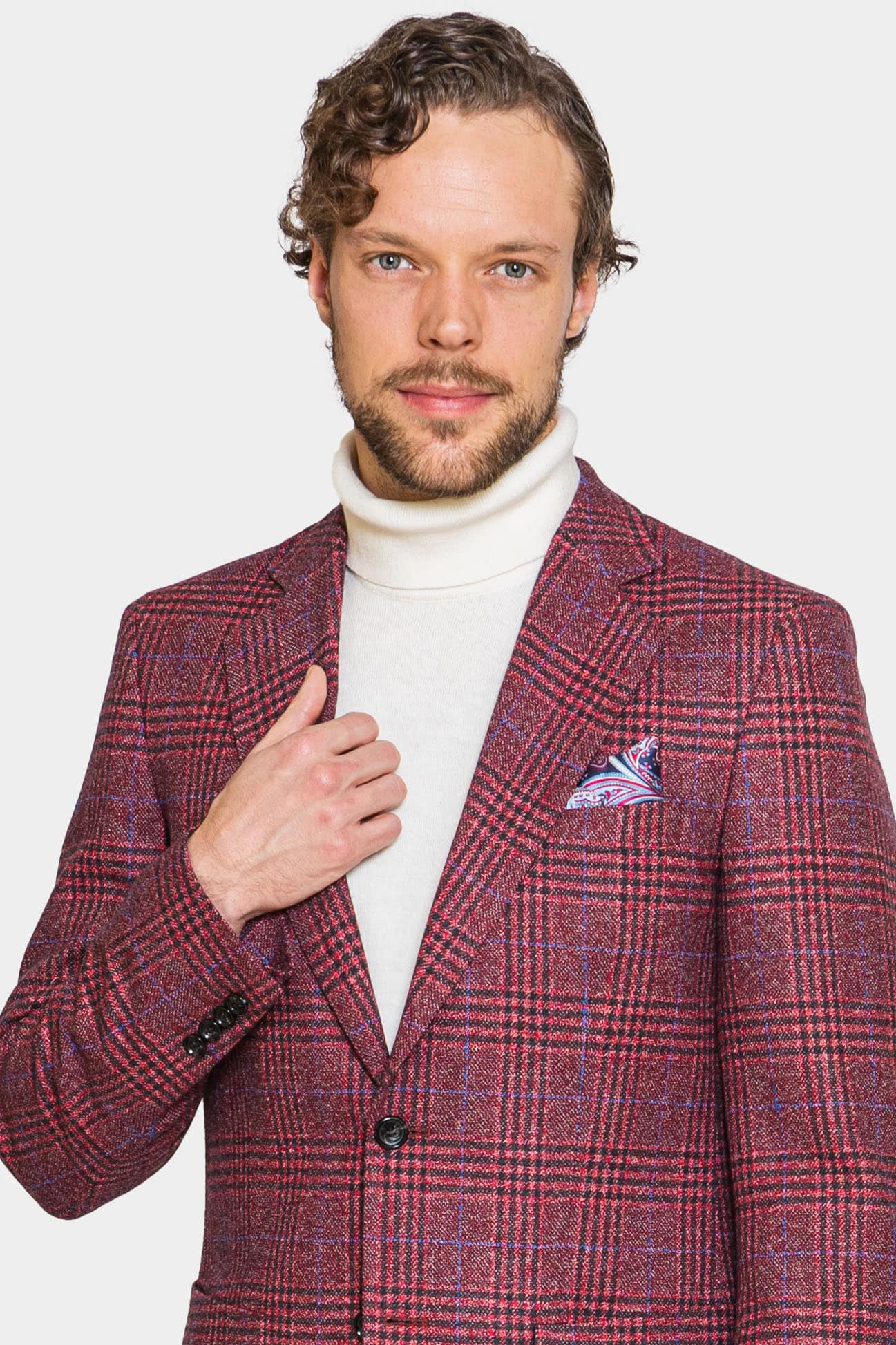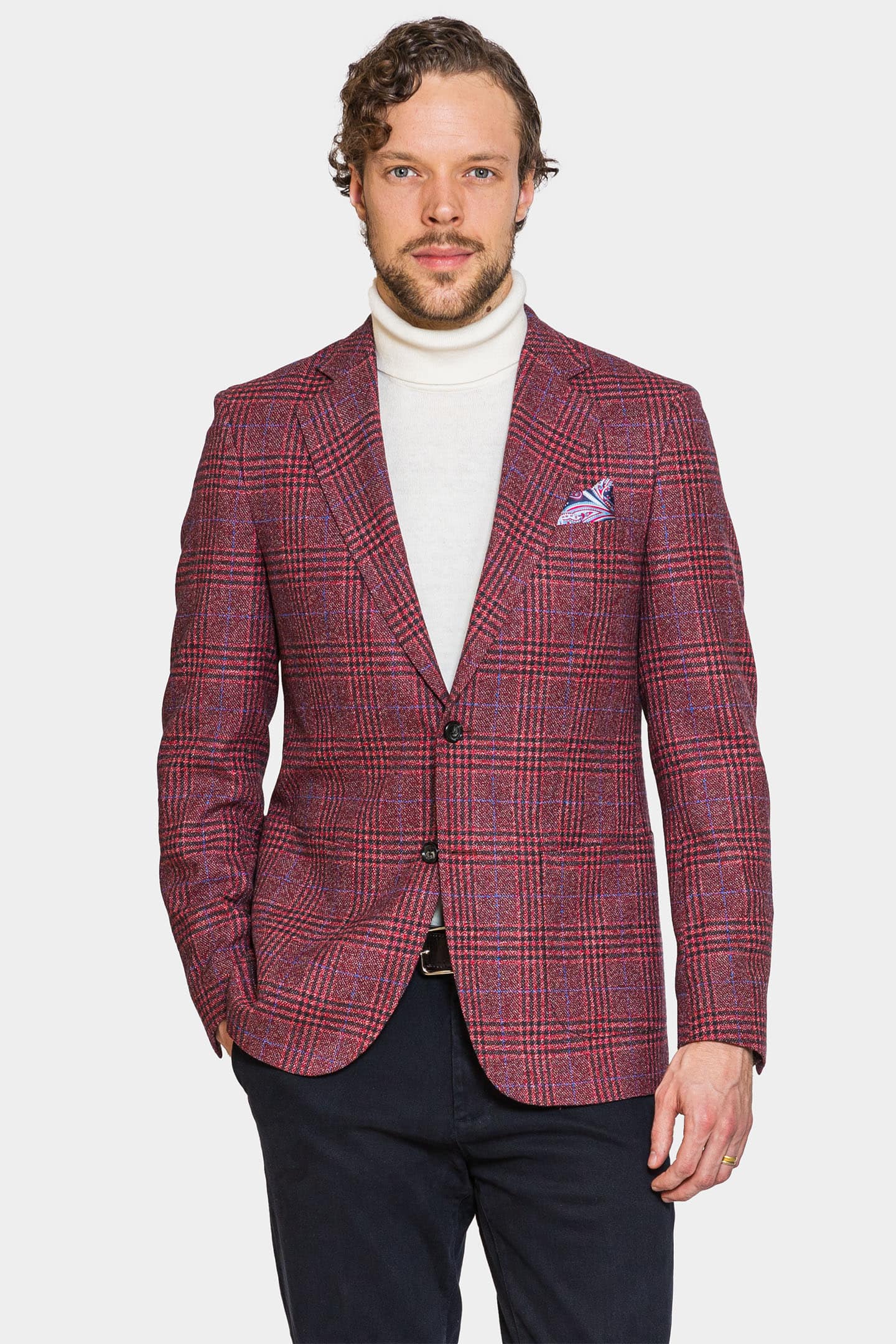 Nottingham Raspberry Check Jacket, crafted from a luxurious wool and cashmere blend woven by Scabal of England, exudes a cavalier charm with its slim fit and striking check pattern. This impeccably tailored jacket, fully lined for added comfort, is perfect for making a statement at a villa party or any occasion where a touch of refined boldness is desired. The jacket features a notch lapel, patch pockets, and double vents, adding to its sophisticated and functional design.